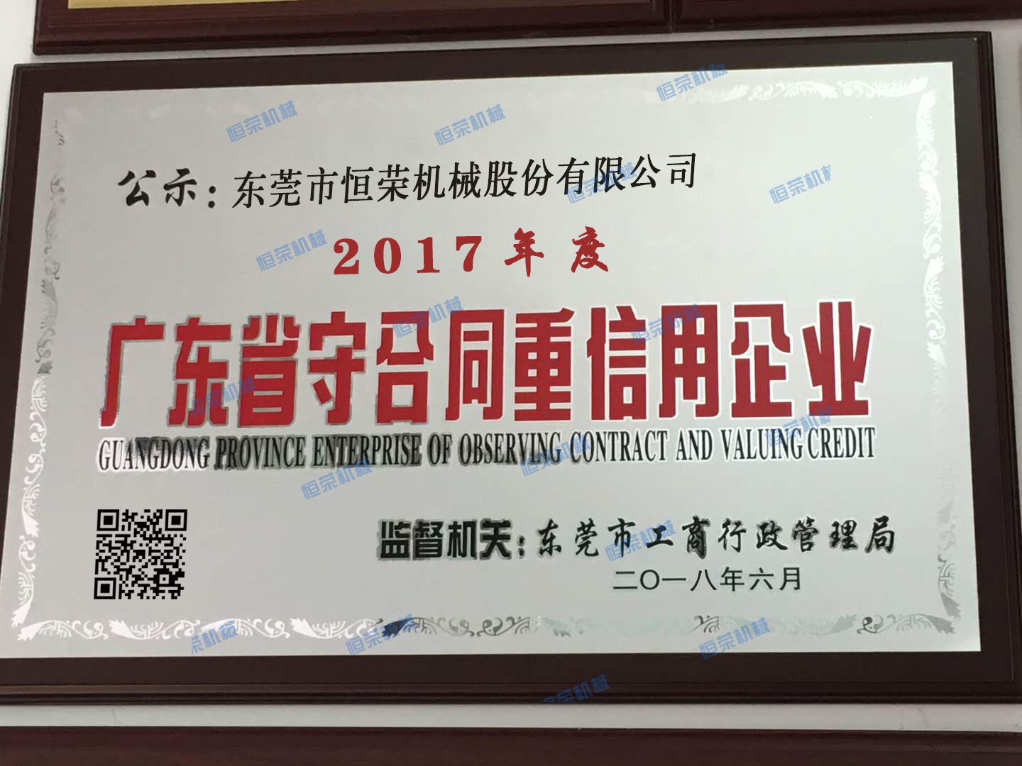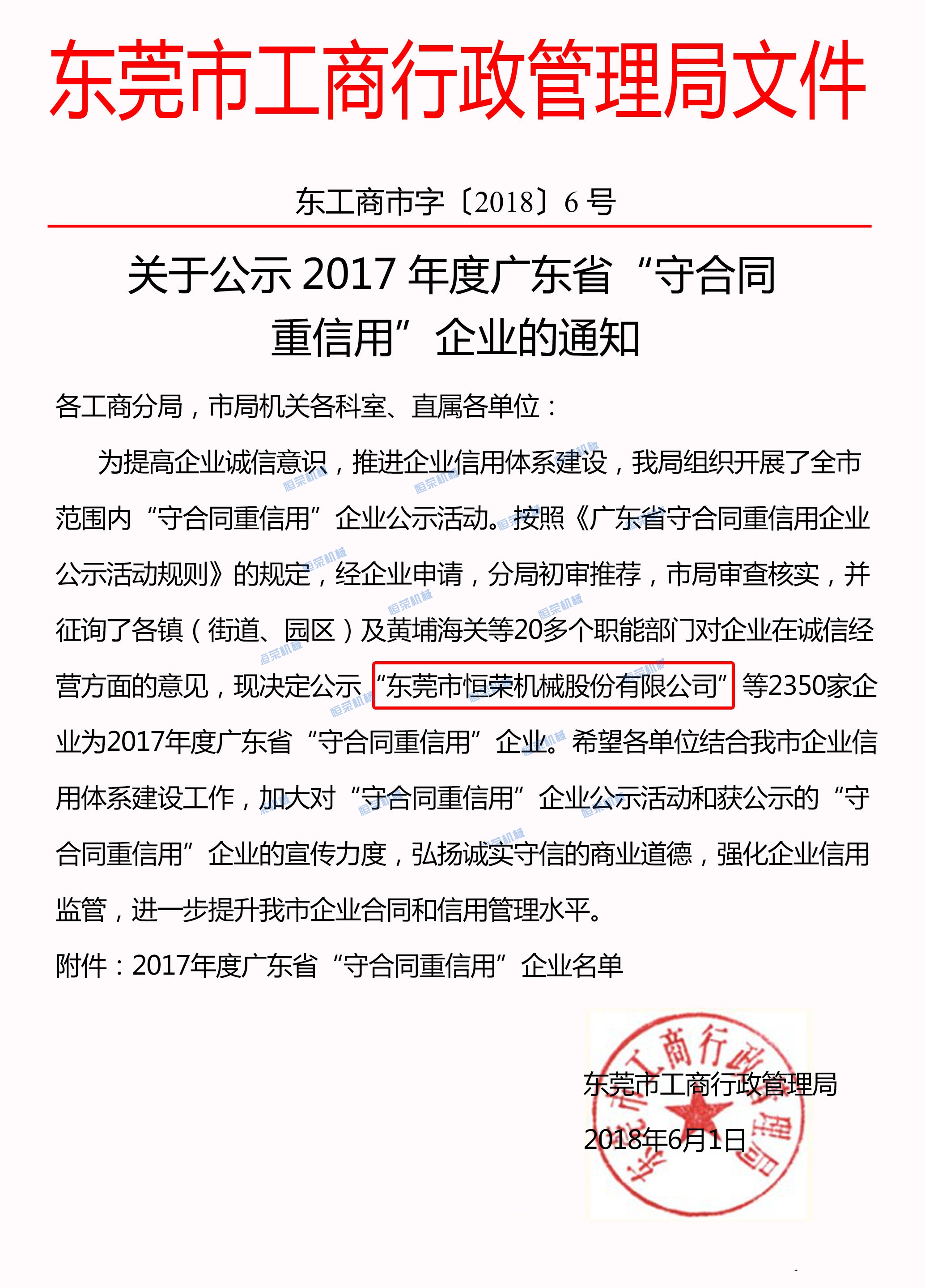 榮獲2017年度東莞市“守合同重信用”企業稱號,表明了公司誠信建設得到了政府主管部門和社會各界的高度認可,彰顯了公司誠信立企的核心價值觀,展示了公司重信用的良好形象。